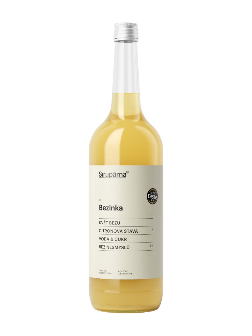 Bezinka je sirup z květů černého bezu, který připravujeme tak, aby vynikla jeho přirozená vůně i chuť. Nepoužíváme aromata ani dochucovadla – jen bez, citron a cukr v ideálním poměru. Sirup má jemnou květovou chuť s osvěžujícím citrusovým zakončením. Skvěle se hodí do klasických domácích limonád s plátkem citronu, do prosecca nebo jako základ nealko drinků.